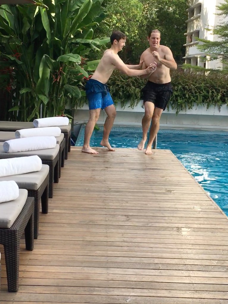 Our extravagant repast was followed by a dip in the hotel’s large pool (we had it all to ourselves at 7am), kept at a welcoming 90 degrees. We swam, dunked, tickled, splashed and threw each other around for a half hour – our revelry cut short only by our impending schedule – though we left time to sample the meditative jacuzzi (lovely) and the scorching steam room (dangerous).