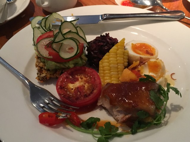 - I got a lovely Thai dish that consisted of fried pork belly, soft boiled eggs, broiled tomato, roasted corn and dark sticky rice
