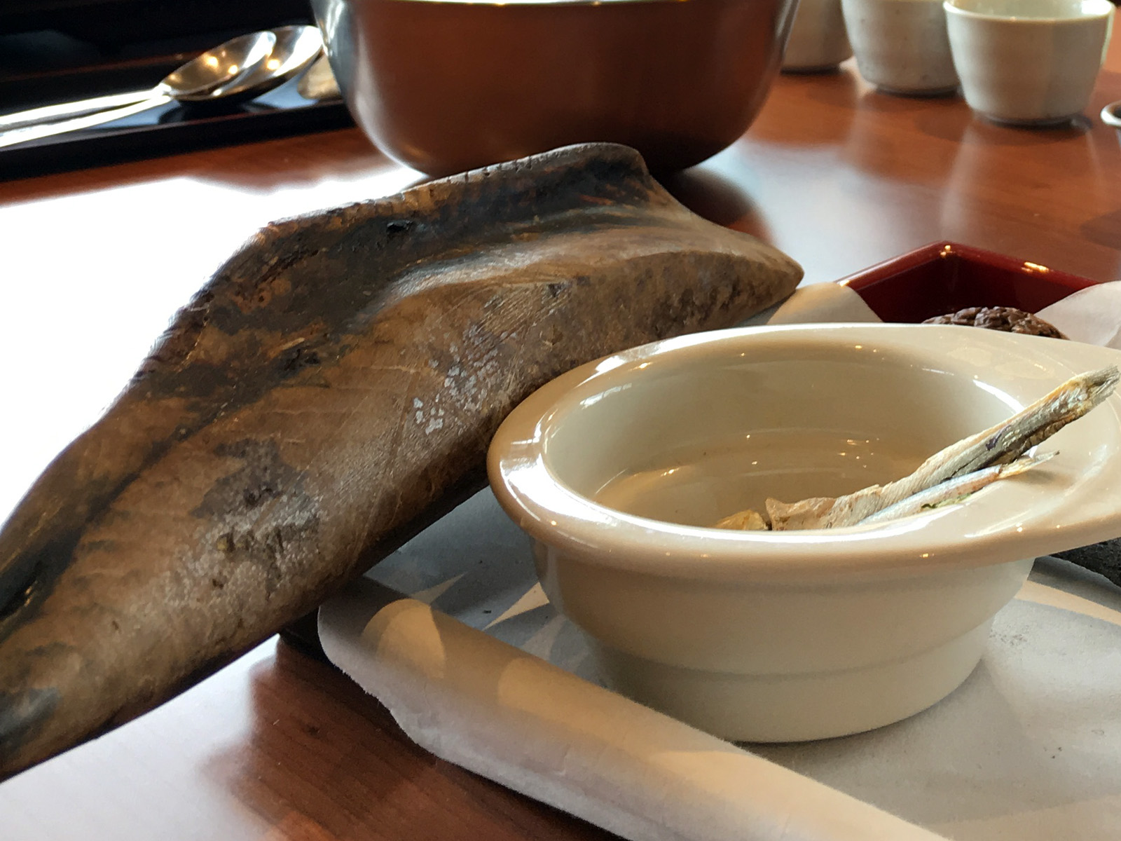 Kazumi took out a heavy object. Is that a rock? Petrified wood? A weapon or primitive tool? Nope, it’s a bonito fish which has been salted and preserved in such a way that it’s solidified into a heavy, smooth, stone-like composition. We’d never seen or heard anything like this and couldn’t believe it was edible. It has the distinction of being the hardest food in the world (Guinness book) and don’t even think of trying to cut it with a blade or attack it with your cheese grater. This thing requires shop tools before it will part with the thinnest shavings. One petrified fish will last years and it could easily be used for self defense should your katana not be available.