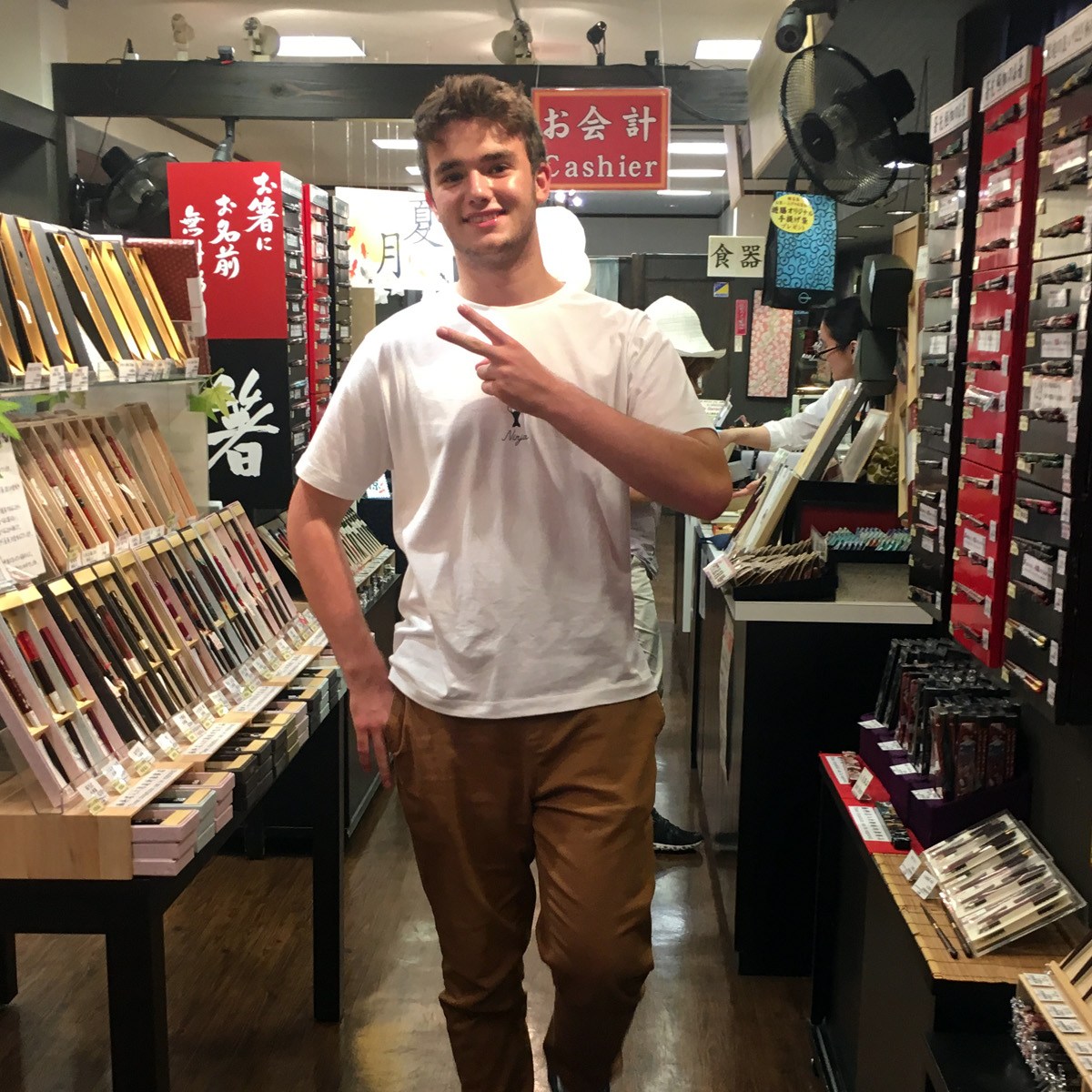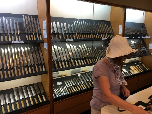 Their beautiful cutlery is sought after by top chefs across the globe. Quality kitchen knives are pricey, and these were no exception, but it was well worth it to this family of cooks. We settled on a 9-inch Japanese style French blade – stainless on the outside, carbon on the inside and a nice wooden handle. Very light, very sharp and felt great in our grip. This will be a family heirloom for Zephyr and when they offered free engraving, we had them inscribe his name in kanji script. Z also found the most intricate little vegetable cutter – a stamp in the shape of a flower.