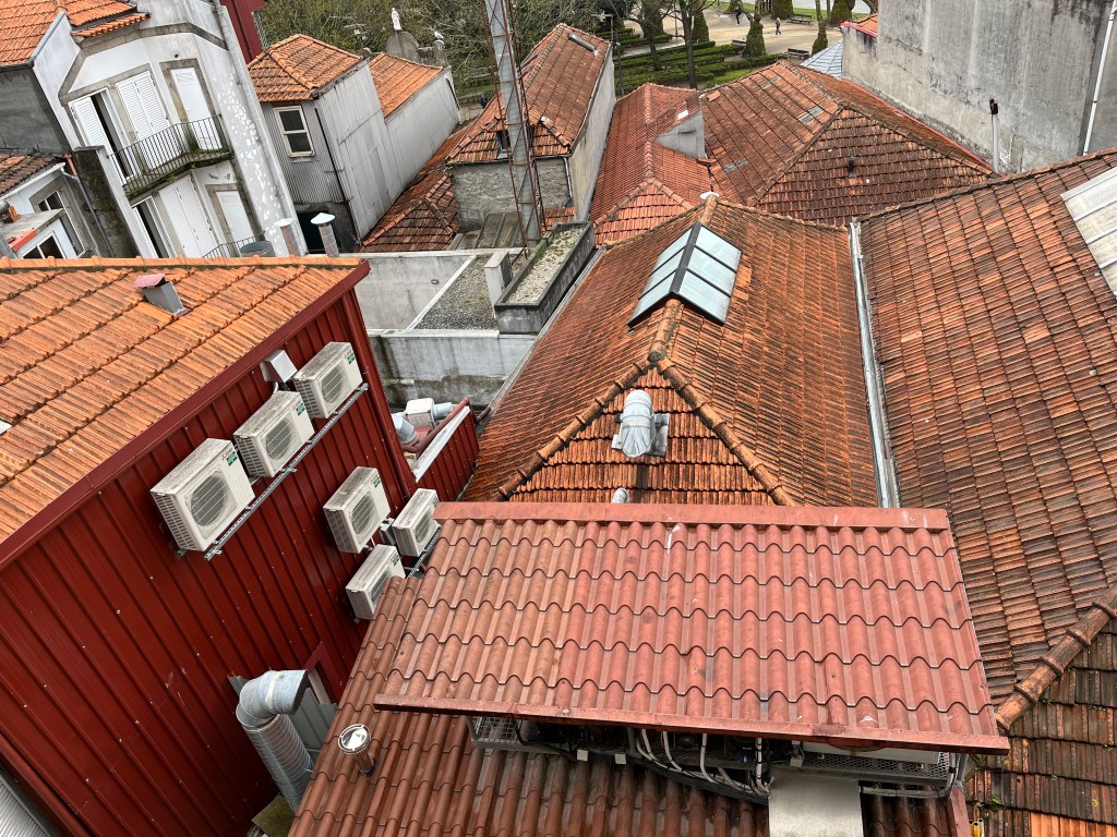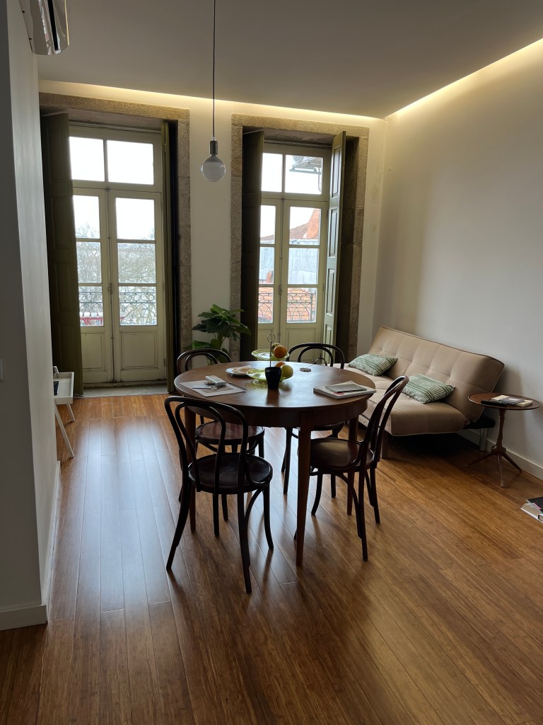 The flat itself is beautiful! An expansive wooden floored modern space in what must be a half-millennia-old stone building. The pièce de résistance is the set of old French doors which open up to a medieval view of the surrounds – and looking at the way they cram the houses together (at odd angles), we’re reminded of our art deco guide’s observation that the Portuguese don’t bother with right angles. Everything is a builder’s nightmare of custom cuts and whatever it takes methodology.