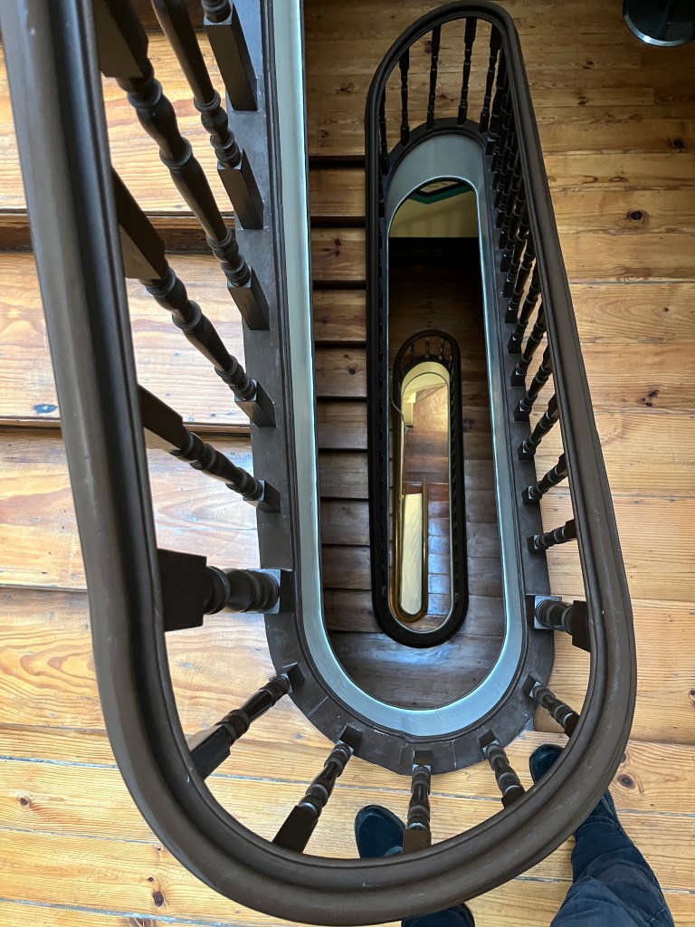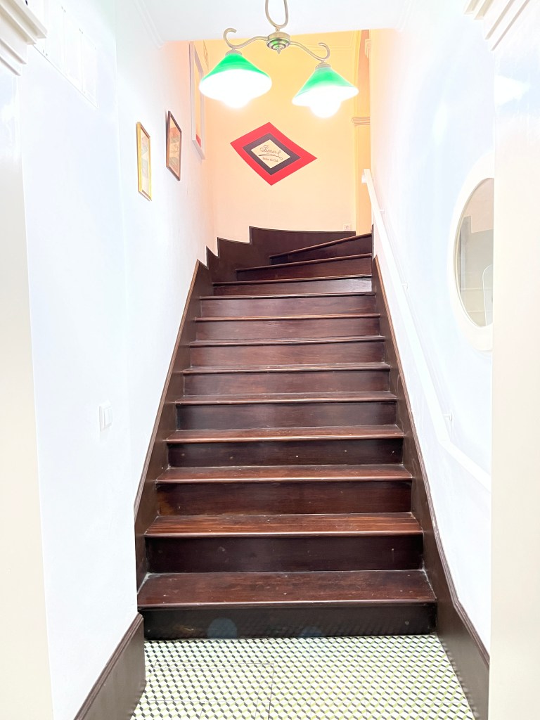 Our flat is the 4th story (again) above a lovely confeitaria (bakery) and the owner gets someone to watch the register while he takes us up. It’s neat that the flights up to our rooms, a gloriously lacquered wooden staircase, is literally right there in the bakery and we’re told we can come down and have breakfast on the house each morning. Fantastic! I don’t mind the absence of an elevator but just for the record, it’s no joke to haul a 60# suitcase up with one arm and not bang up the nicely finished steps.