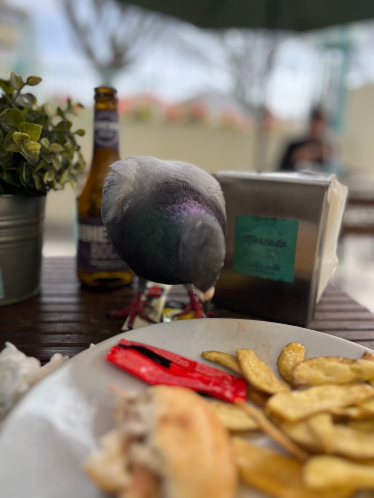 I wander in town a bit and find a delightful place to grab a bite. It’s a delicious approximation of a burger and fries. Visiting pigeons edge close and while I snake out my phone to capture this moment, one makes a break for it and grabs a couple fries, cheeky little bastard.