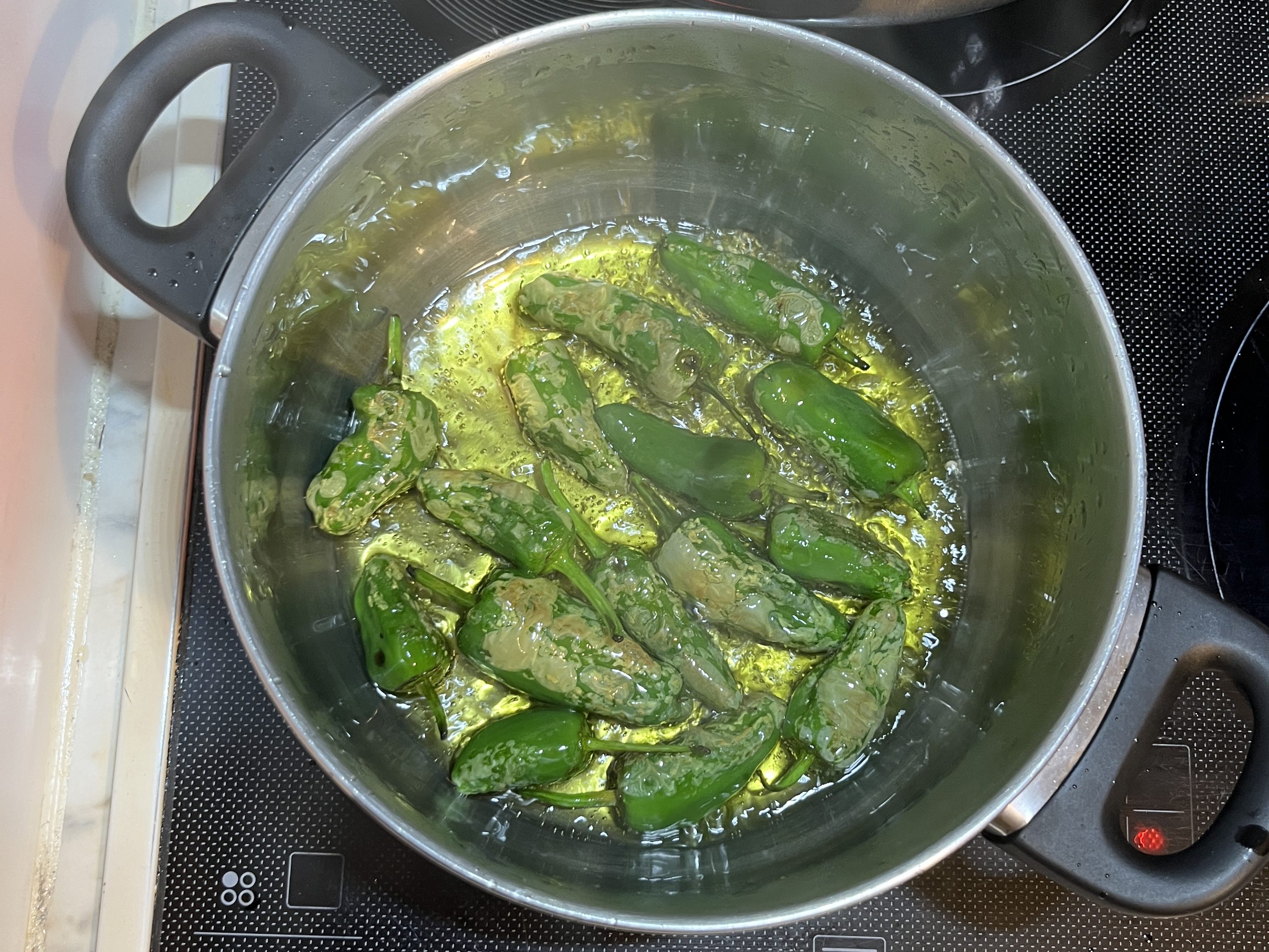 After introductions and a tour of his herb garden, a delicious Douro red is poured, and we jump into tapas. A chouriço is sliced (3/4 through), placed upon a special cooking dish and set on the table followed by a plate of local sheep and goat cheeses which will soon fulfill its destiny with a basket of assorted freshly baked loaves. A bowl is brought out and we combine olives, oil, minced garlic, oregano, coarse salt, pepper, and a bay leaf. Another sausage, the very same one mentioned in a previous post employed by Jews to avoid the Inquisition, is tossed without oil into a pan to brown. Stasia heats a quantity of olive oil in a pan then adds a couple dozen whole chili peppers, which sizzle and blister beautifully – moments later poured into a bowl and dusted with salt.