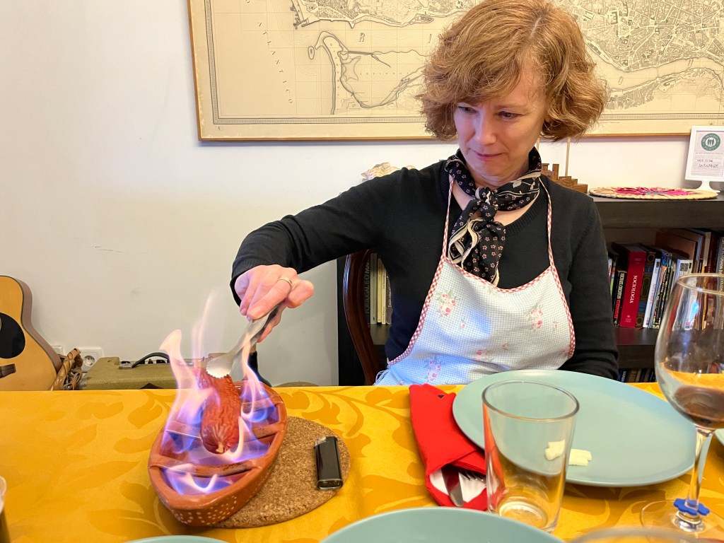 Wines in hand, we’re ready to taste the fruits of our labors, which are all, of course, delicious but there’s a dramatic presentment. Nuno pours some moonshine into the trough under the chouriço, gives my girl a lighter, and ‘poof’, the sausage sizzles in a table-top bonfire. We are delighted by this theatrical way of cooking socially – fire in every form is a central gathering point, a reference all humans can relate with.