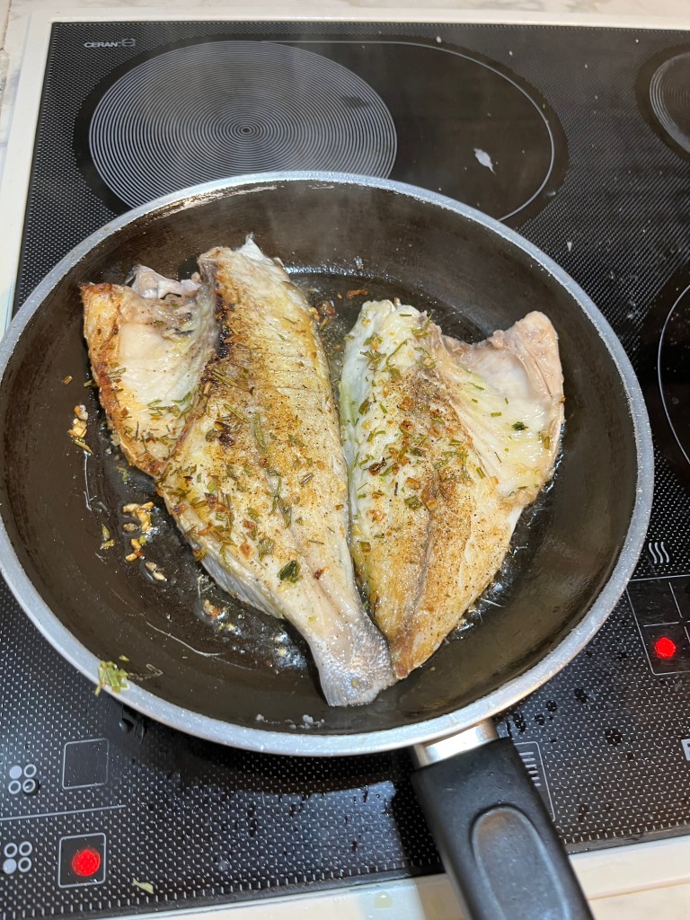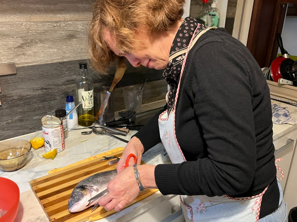 Course three commences and I couldn’t be more excited to see Stasia filleting an ocean bream for the first time. She murders it completely in true Sicilian fashion. The pride in her countenance is priceless! She salt/peppers the filets and gets a hot pan started. Meanwhile, I am tearing fresh cod directly into the onion/garlic/water/tomato/rice concoction we just threw on. As I rip and shred the fish flesh, Nuno grabs a bit and tosses it into his mouth and I do the same. It’s so delicious and I love raw moments like that. Returning to the table, we eat the bream and cod rice with plenty of green wine.