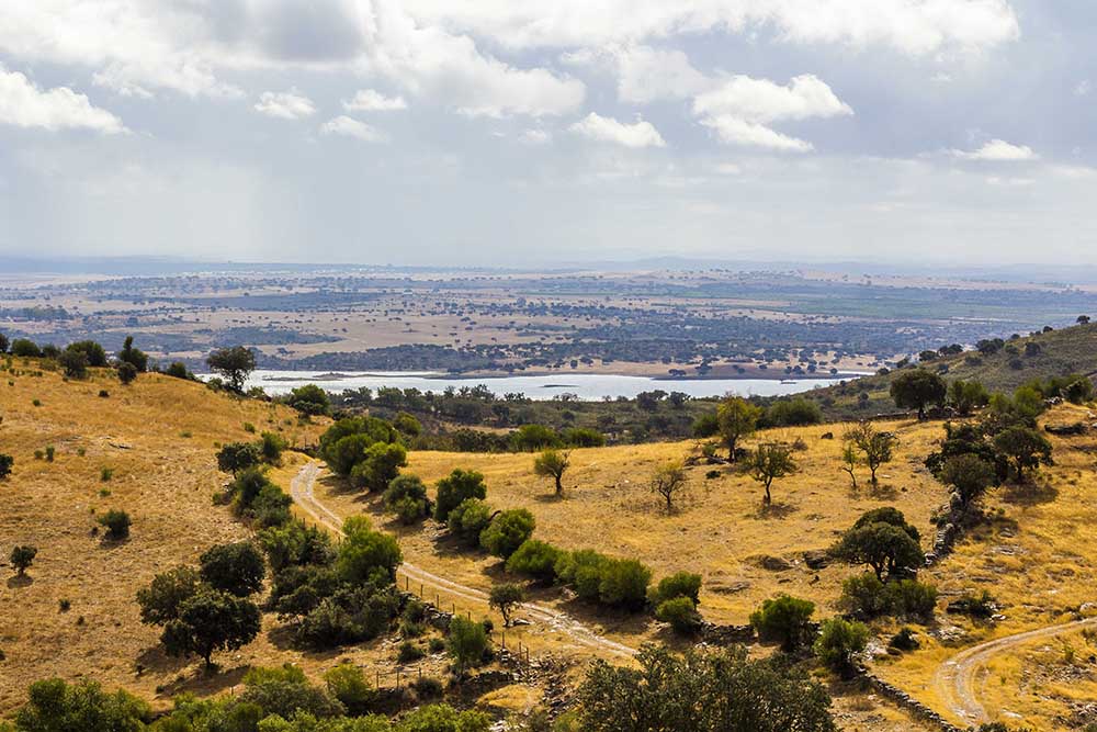 Once we get out of the greater Lisboa region, we enter the magical Alentejo. It’s markedly different – sparse with wide plains and gently rolling hills with occasional hints of the granite earth poking through. Every so often we see grazing livestock but no other hints of civilization. The trees dominating the landscape are new to us – they evoke exotic lands, sinewy Mediterranean shapes, and African desert canopies. We later learn they are stone pines and two types of oak: cork and holm. This is the world’s cork oak growing region and we observe so many of them being farmed for their bark in a sustainable way that doesn’t kill the tree. This vast vista is very agreeable to us and as lovers of the desert, we feel it’s as if the whole region had some of the best attributes of all the forested areas we’d been in before.