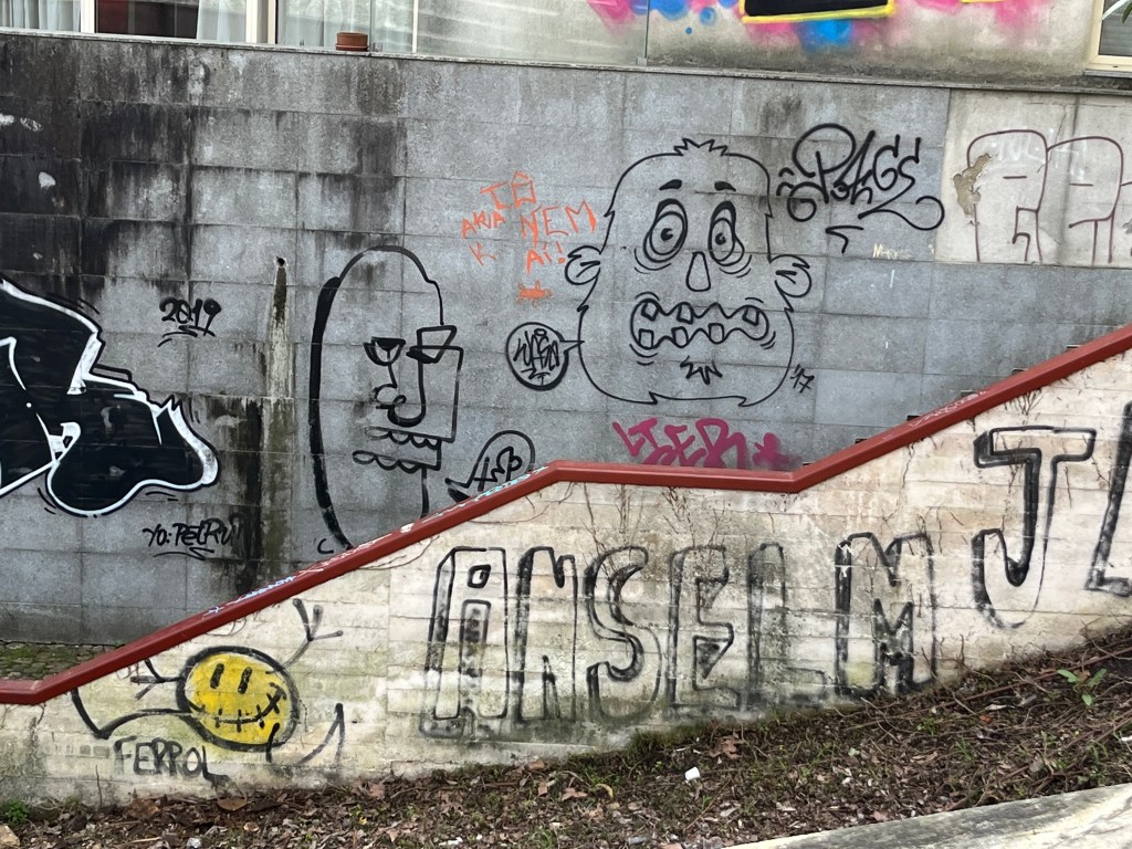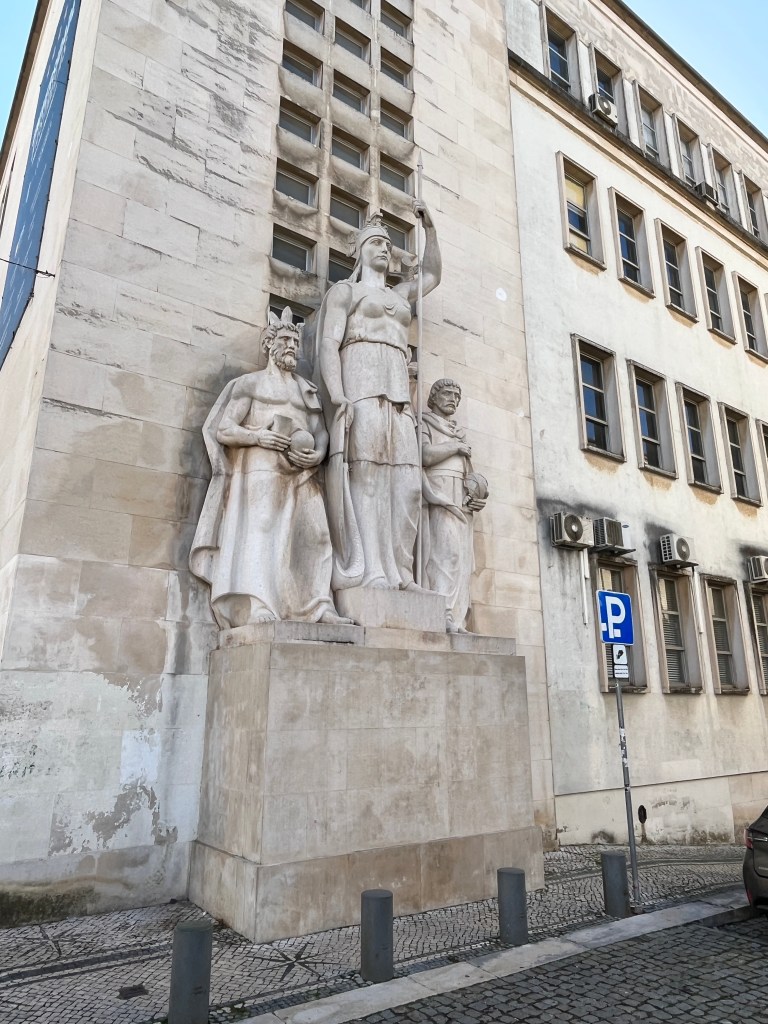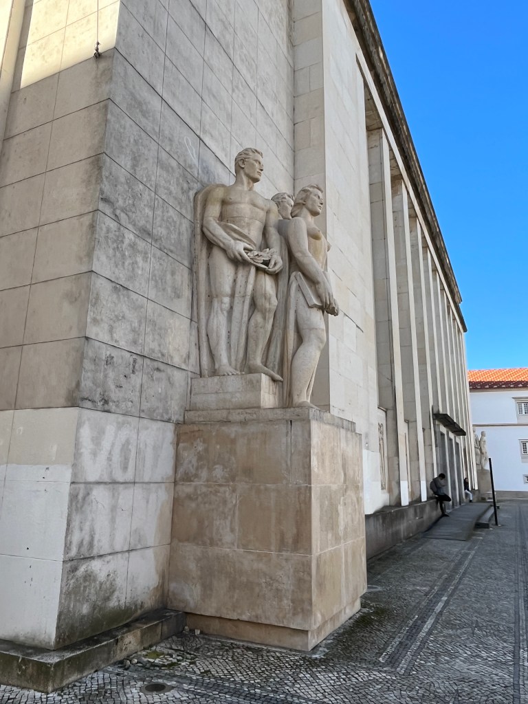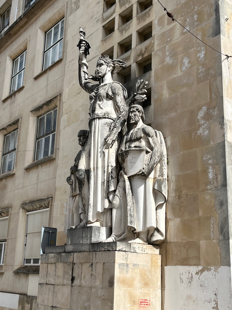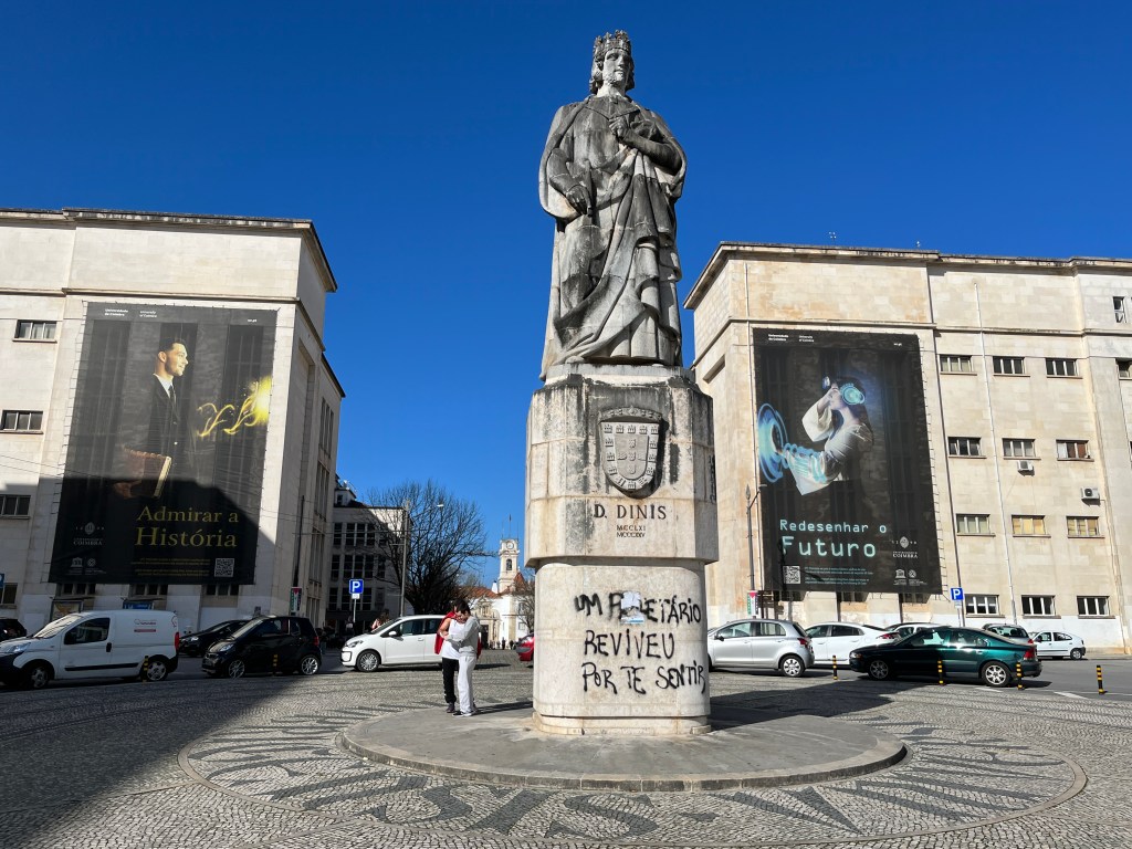 After a few flights of wide, stone steps, we’re delivered onto a large plaza, which is being watched over by King Dinis – or at least a 50-foot sculpture of the 13th-century monarch. Quite effective, this. His posture is stoic, wise, and welcoming despite the ugly spray paint (which we translated to say “The planet is revived through your feelings”). These buildings and the knowledge they contain are a gift from him to the world. Some of the towering statues about are in their birthday suits and we reflect that without education, we are naked. It is knowledge and curiosity that enables us to rise above, enrobing and protecting us – though to be fair, some types of knowledge and curiosity demand the absence of garments.