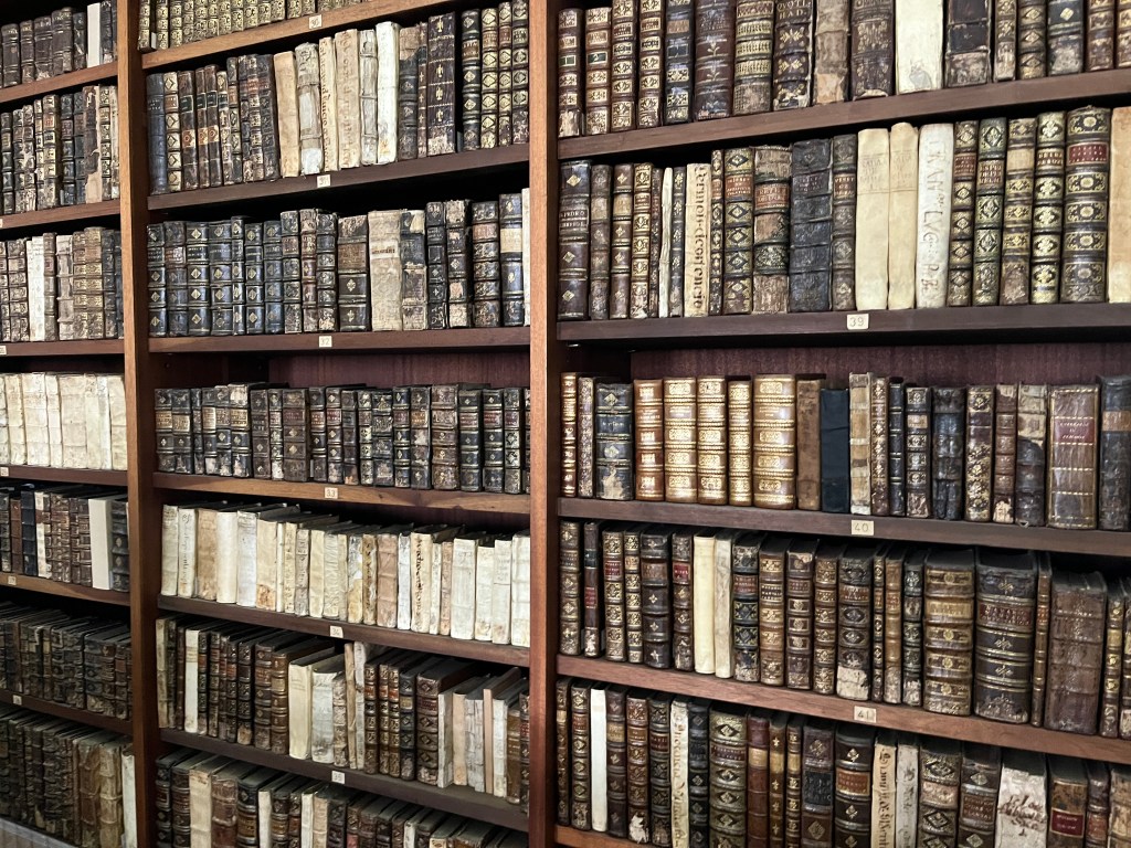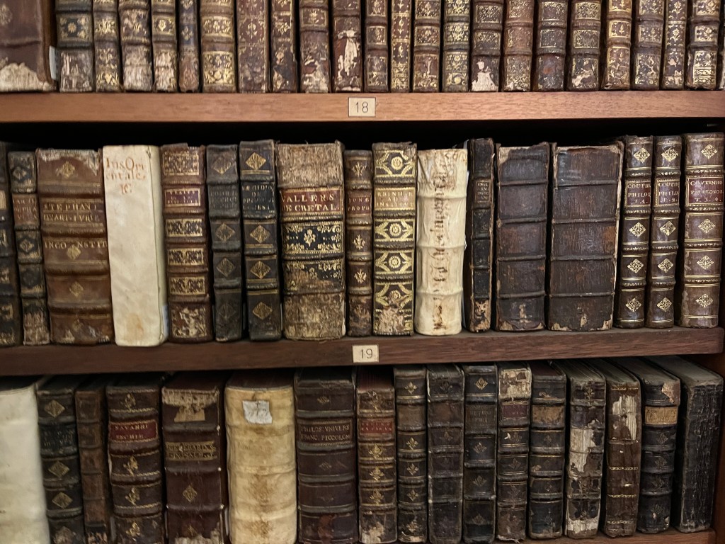 It’s exactly what you might imagine a royal Baroque library might look like – with frescoes and tapestries, gloriously ornate decorations on every tactile surface, miles of rich red velvet, Latin inscriptions touting the value of study and knowledge, massive mahogany tables, ladders and shelves, floors and floors of tightly packed volumes (all of which are being painstakingly digitized and shared with the world).
