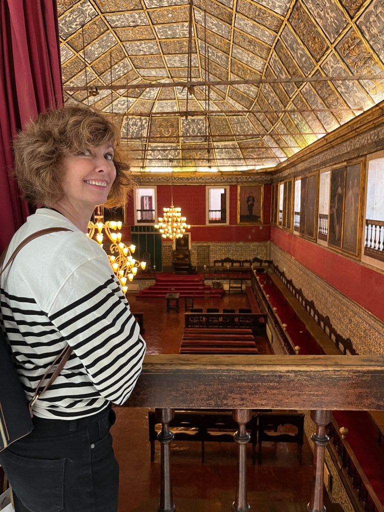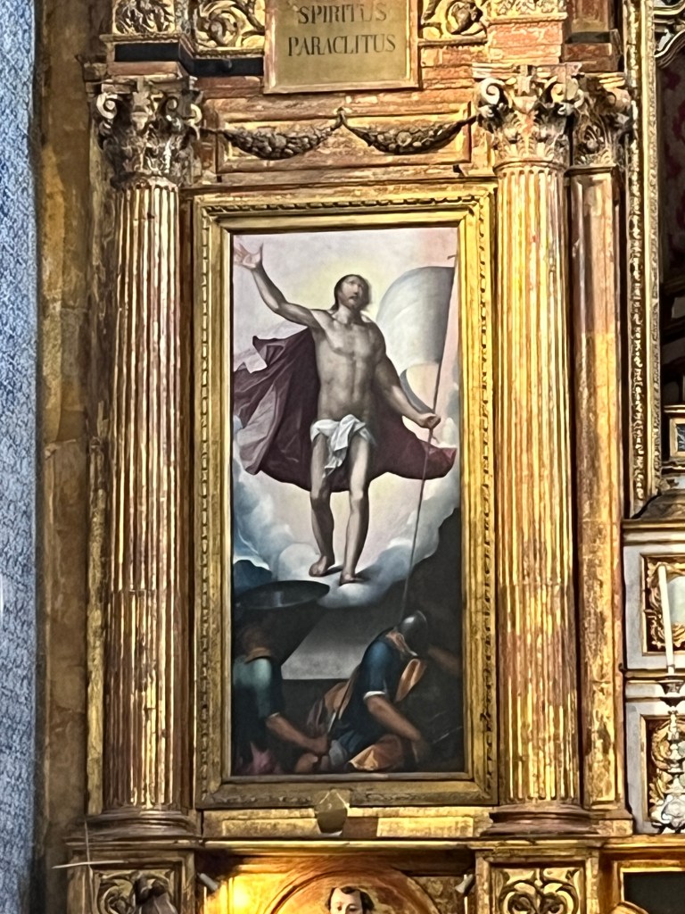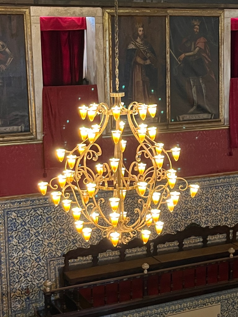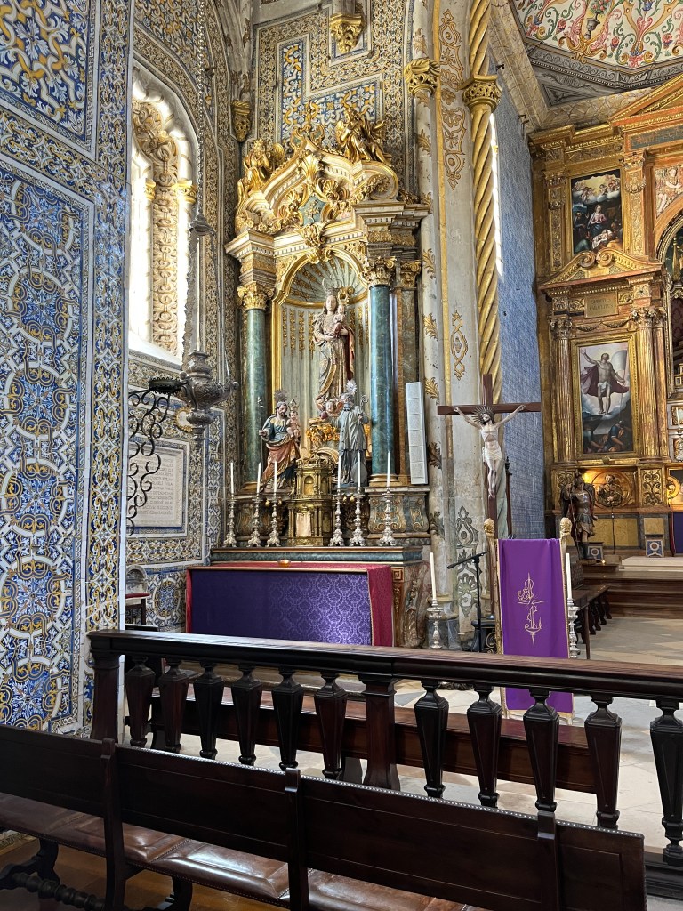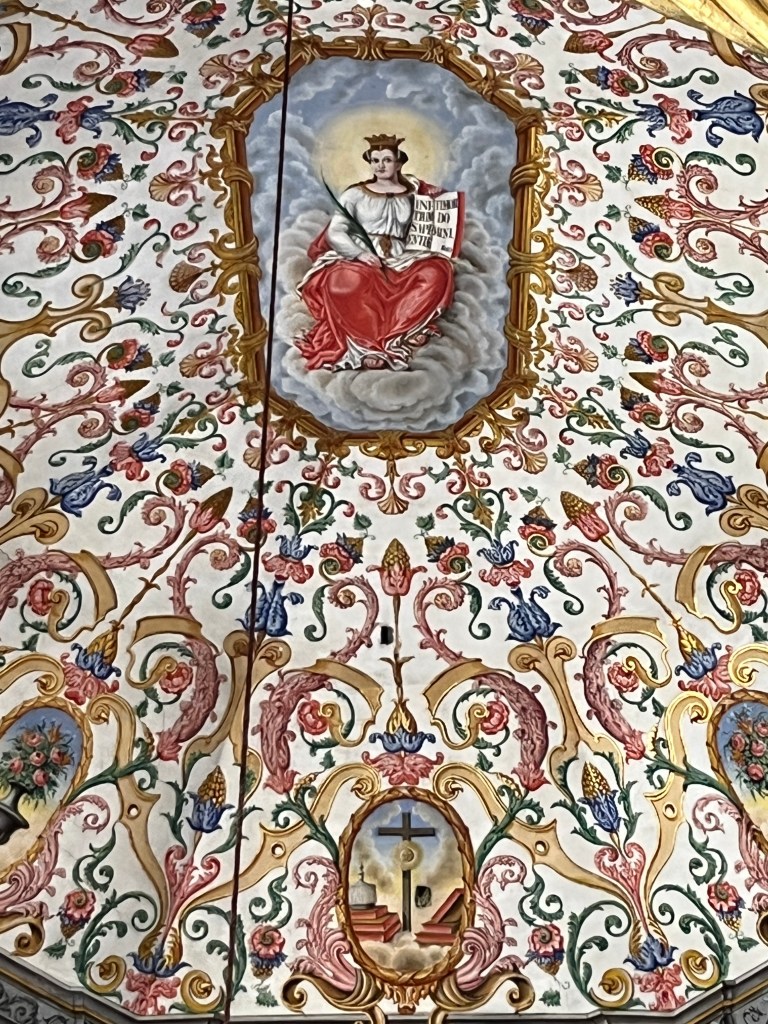 There was a set of progressively smaller rectangles in the center and I postulated they might be a ‘stairway to heaven‘ – which João confirmed (I hope they got permission from Led Zepplin first), and said it’s also called Jacobs ladder. The Saint of Education, also known as ‘the lady of light’ was well represented in sculpture and painted form – the former having a rather large crown on her head which our guide told us was done by the founder to prevent any future king from thinking he was above the institution of knowledge. The stylized depictions of the big J had him holding white flags and the only crucifixion symbol was very small compared to everything else.