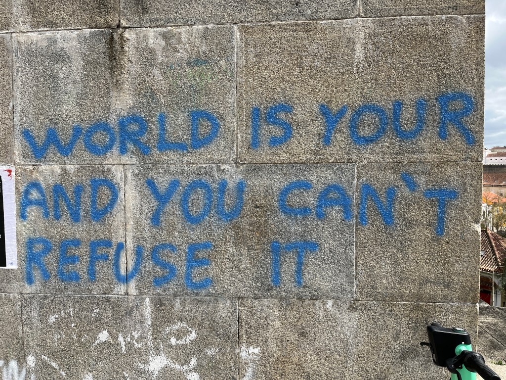 On the way out, there is an unsightly graffito that actually has the most poignant message. We translate it to: The world is a gift you cannot refuse.