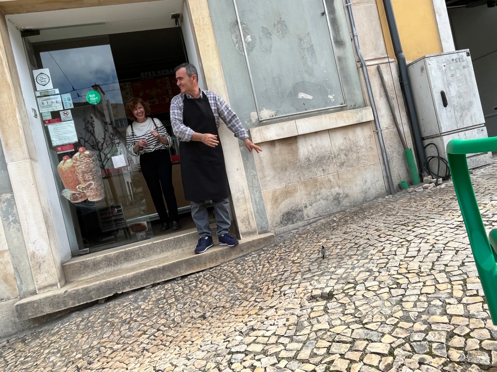 We pulled in with just enough time to be greeted by our host and for me to get my computer up and running for two back-to-back meetings, which are a bit hairy due to the sluggish internet. Stasia recommends I use my cell signal which saves the day. We end our big day sharing plates of wonderful Halal kebabs, fries, and salads we’d picked up in Coimbra before heading out.