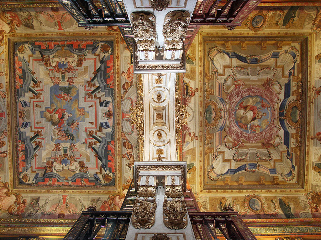 Once a royal palace, later a place for Illuminati tongue-wagging and pedagogical pretensions, there were a few areas of interest that caught our eye. The throne room was quite resplendent having been the place for many a kingly coronation and gradoise academic ceremony. The ceiling in particular was fascinating – completely covered with illustrated panels depicting grotesque maritime monsters of old – serpents, leviathans, and mermaids.