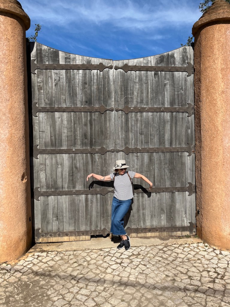 It drops us off nearby the beach and we park. We’re anxious to see what kind of praia is waiting over that rise but stop for a couple fashion photos against the gates of ye olde castle.
