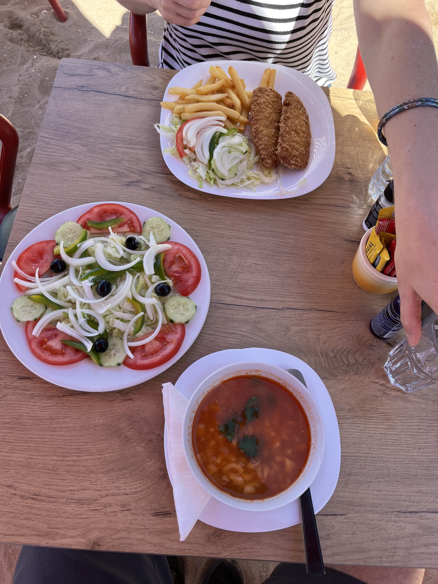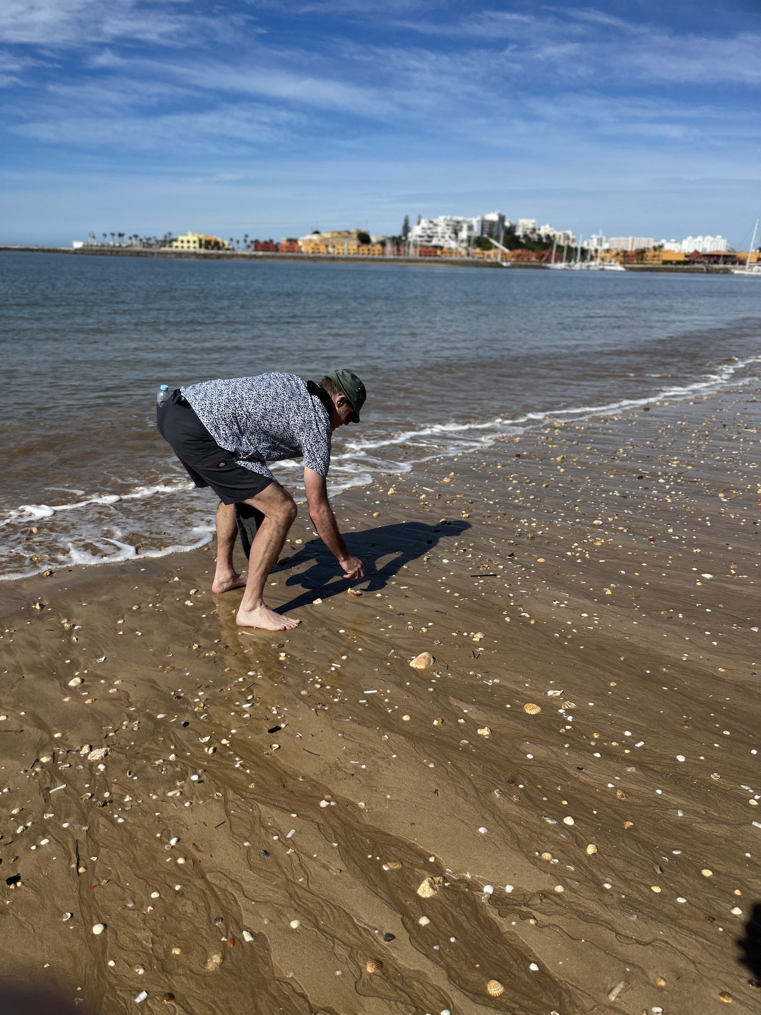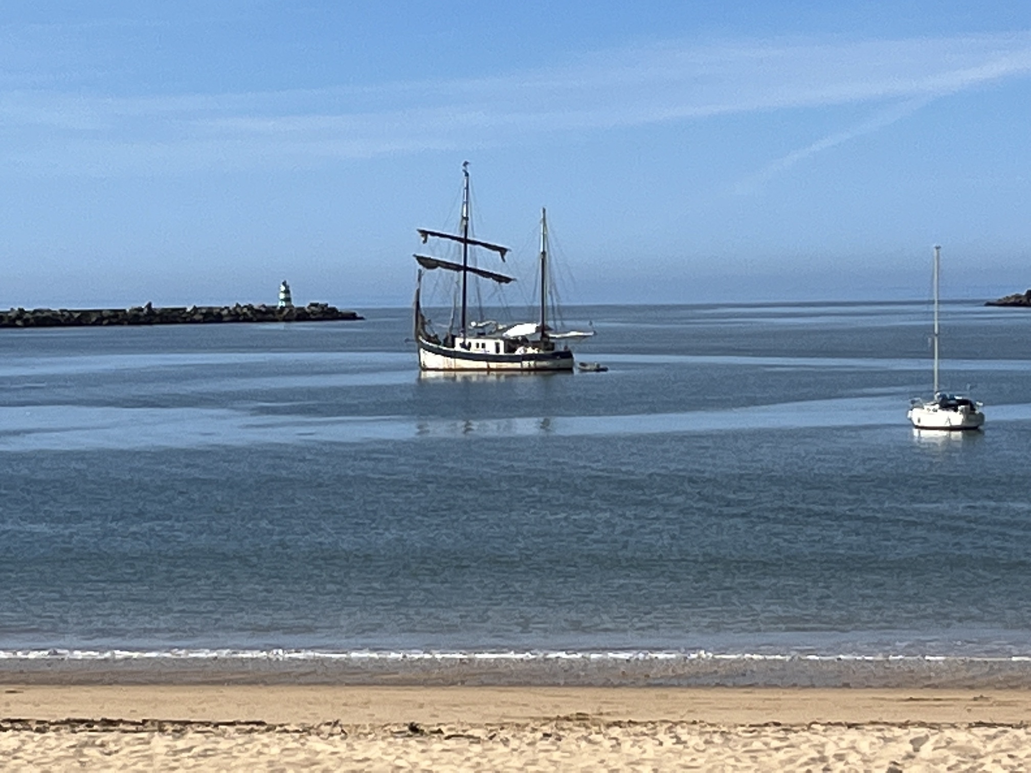 There is an old ship with two masts and a rolled-up sail that looks like a prop from a pirate movie. An American couple strolls past with a bag and with all the shells strewn about you’d think they were collecting – but when I see them pick up a piece some detritus and a plastic bottle I realize what that bag is for. I thank them for their care – it really made my morning and I realize it’s one of the few instances where I’ve seen trash outside a bin.