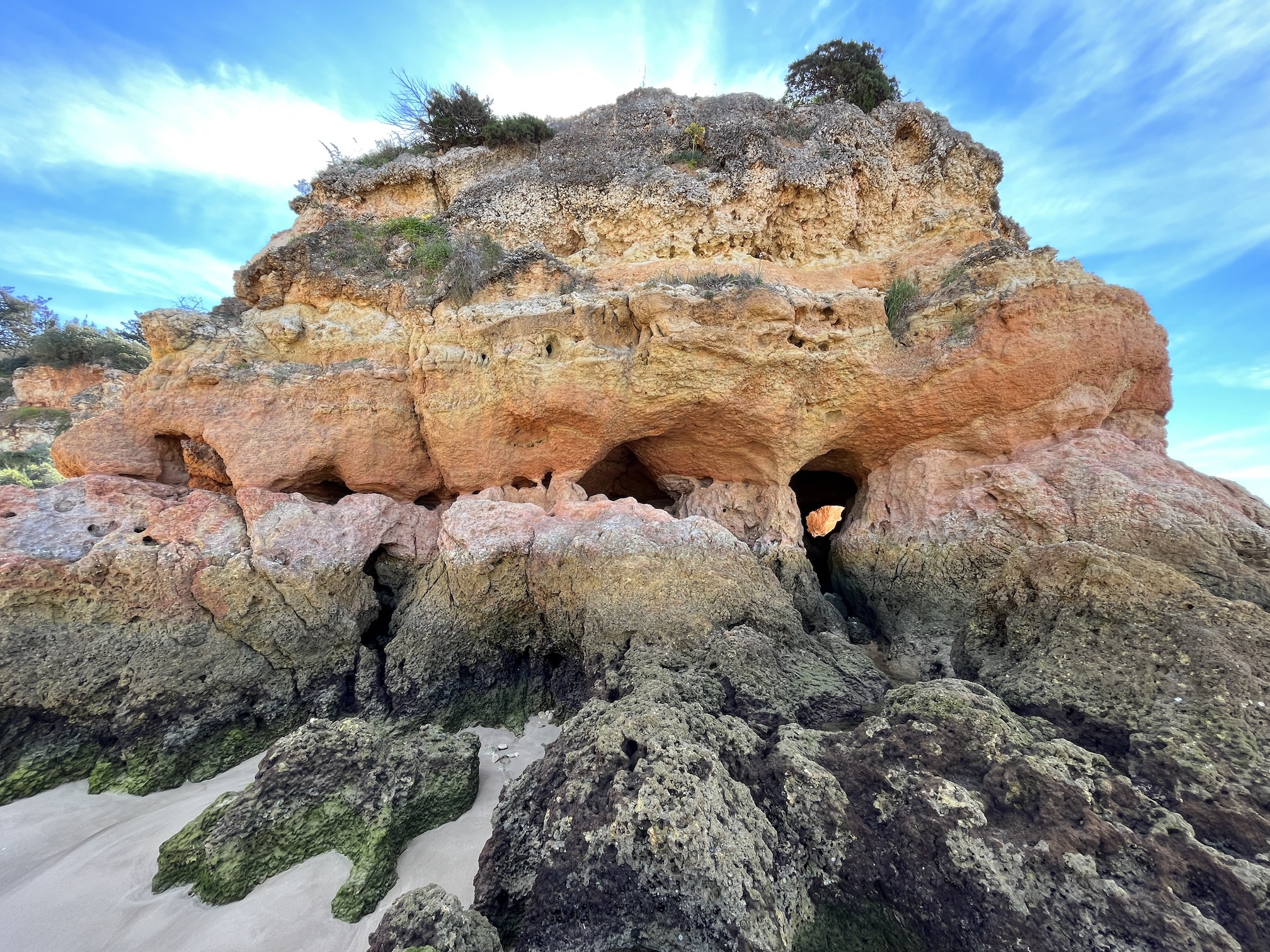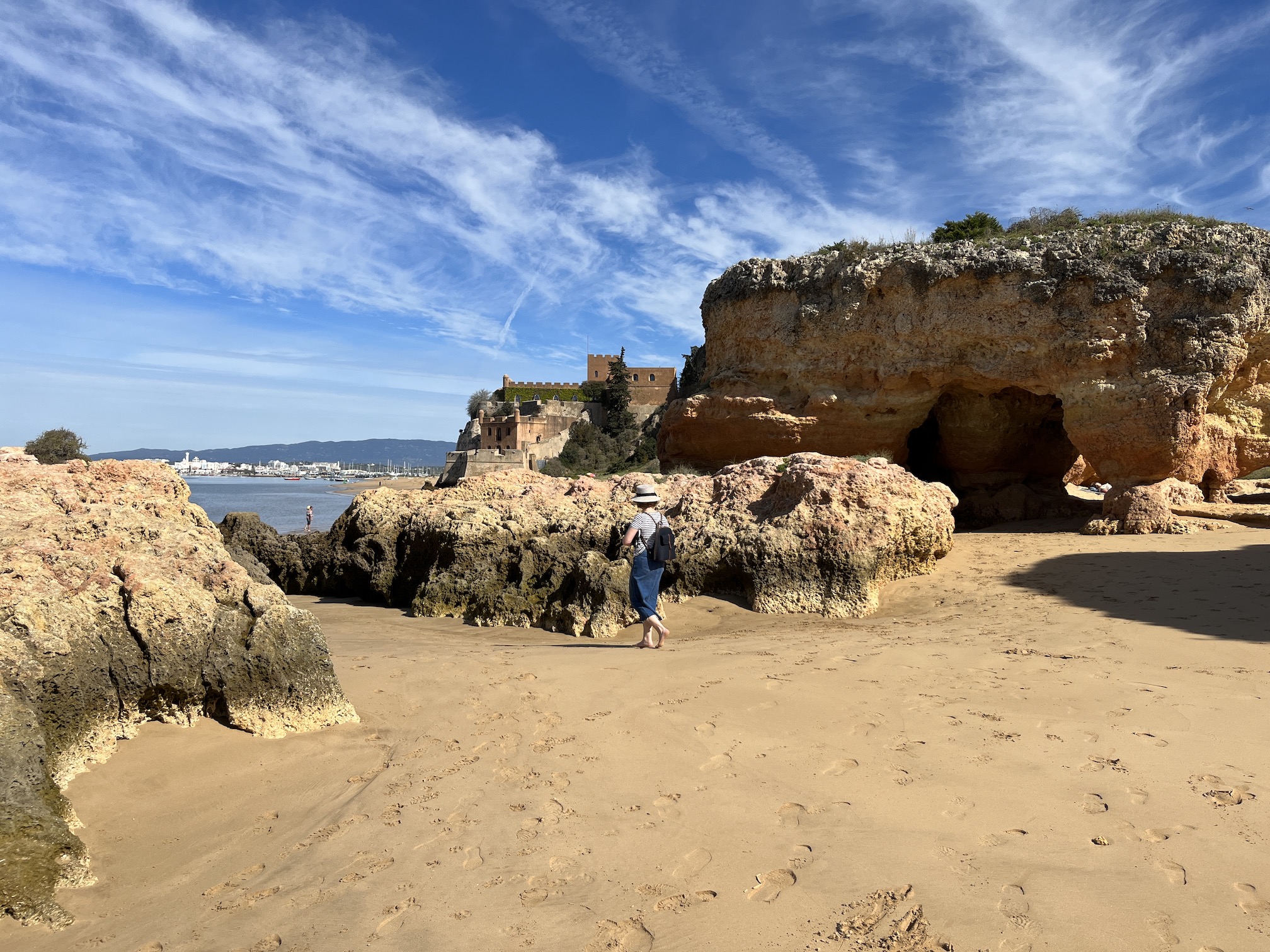 Strolling further we see Castello de João behind some large impressive limestone formations, their windblown hollows providing caves, nooks, and crannies for sun-shunners and their picnics.