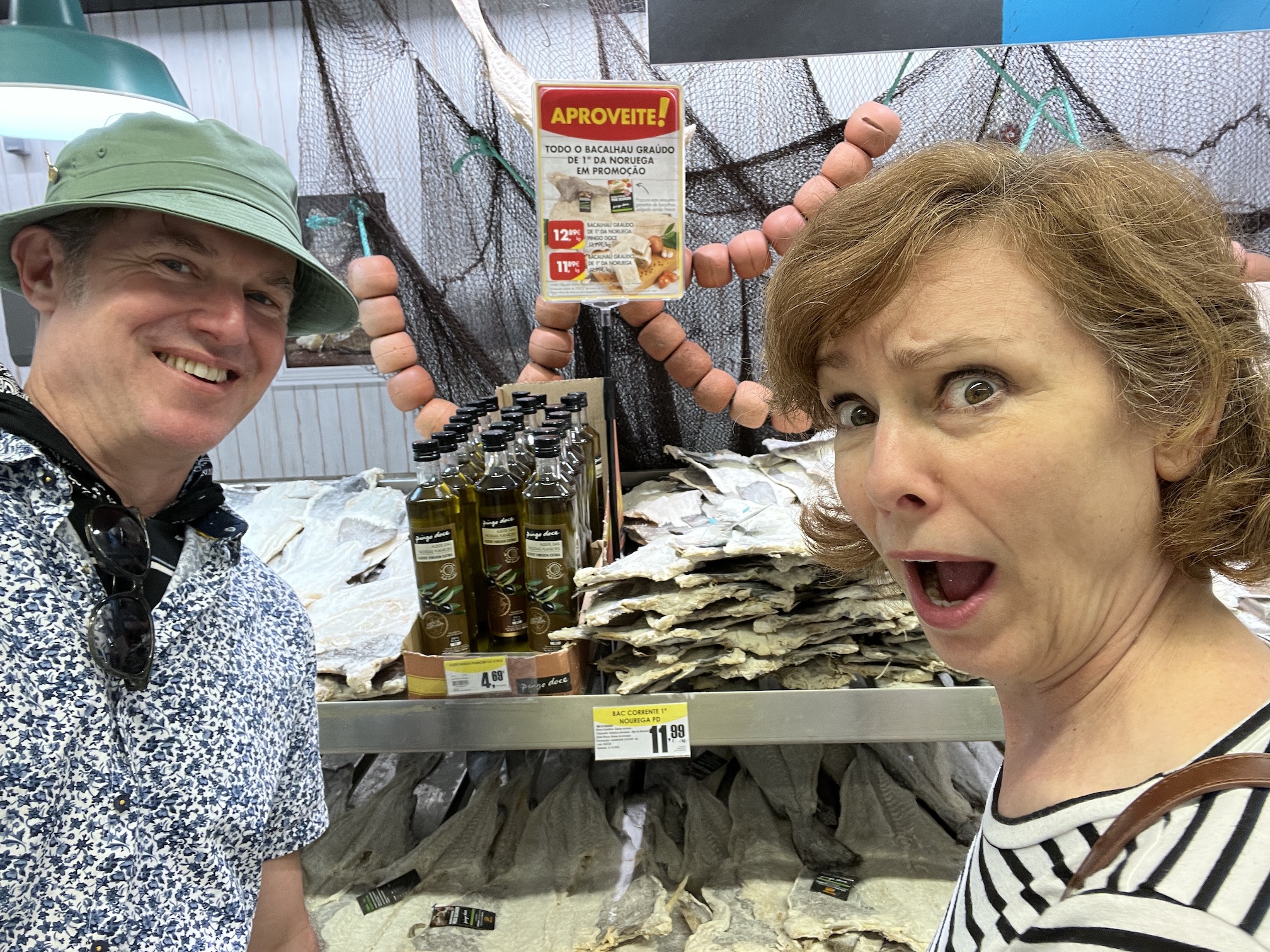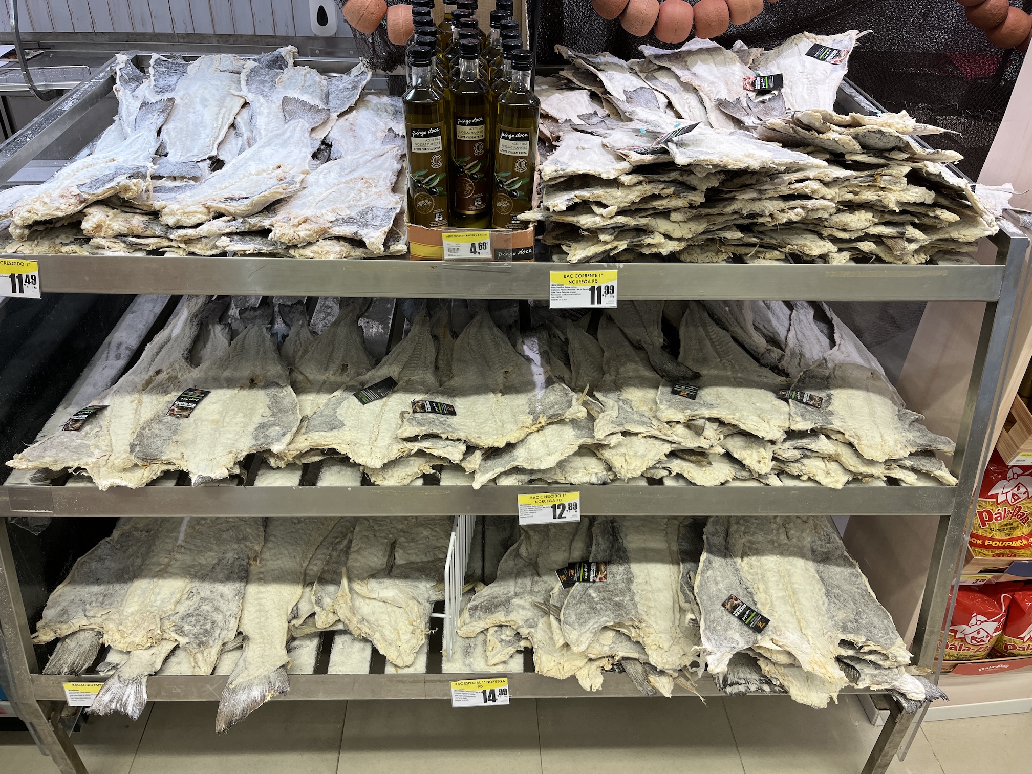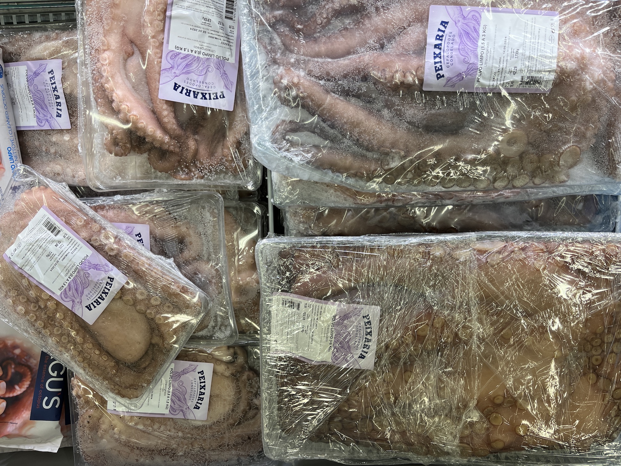 Back home, you’ll find frozen meat sections packed with hams, turkeys, and chickens. They have some of that here, but by far, octopus and cod are the headliners. The former is packed into large roasting pan-sized containers, frozen and formidable. The latter is dried, salted, and stacked on racks, and in this form, it’s called Bacalhau and used in many popular national dishes that we’ve sampled.