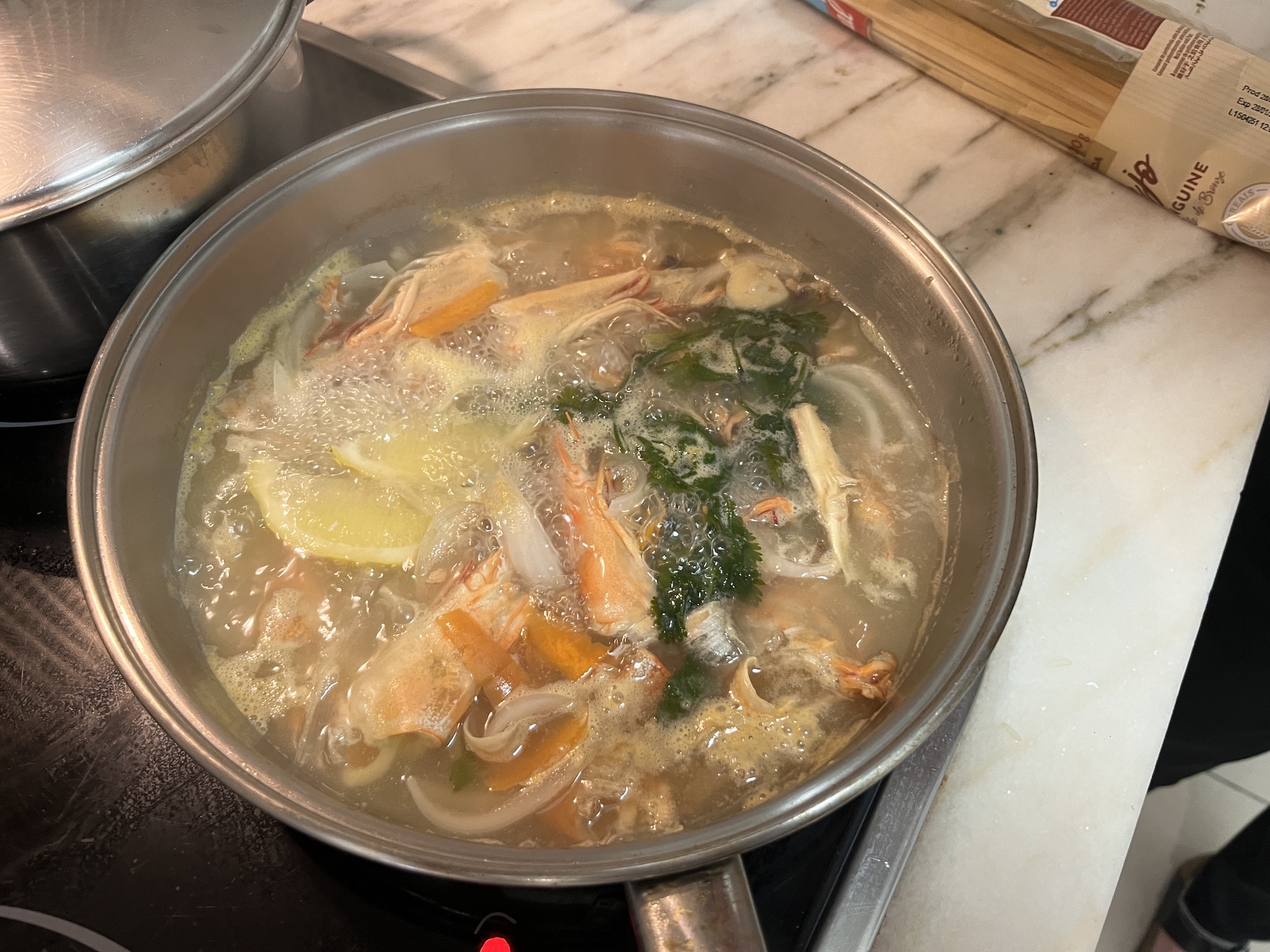 This foreplay is followed up with a sexy, briny linguine with fresh clams, courtesy of chef Stasia who deftly fortifies her wine, garlic and onion reduction with the wild caught blue shrimp heads I just removed in prepping for the next course. Her pasta dish is a symphony – piquant pops of fresh shelled clams with seasoned pasta in a lemony garlic broth – chopped cilantro to garnish.