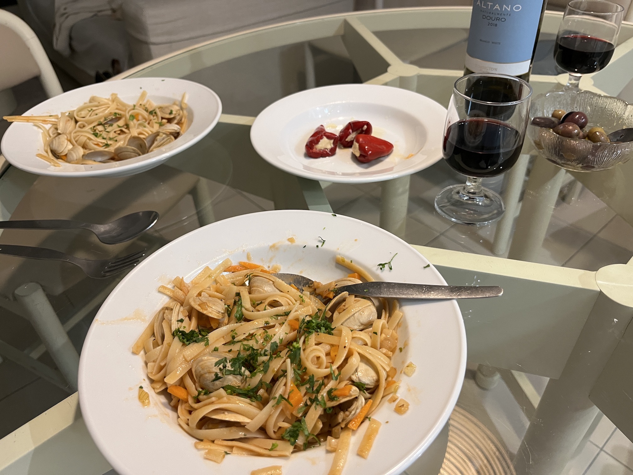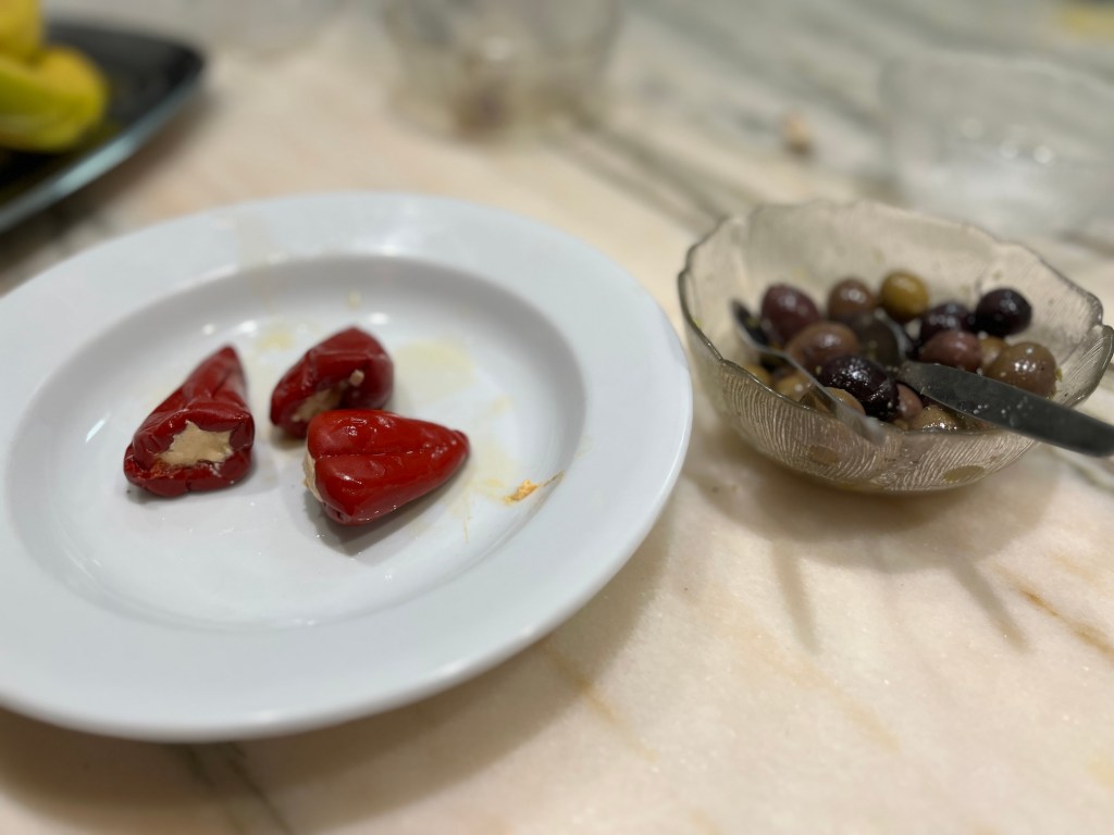 We begin with a bowl of olives we scored from those Portimão farmers and give it the kickapow! treatment Nuno showed us by adding olive oil, raw garlic, salt, pepper, oregano and a touch of balsamic. This is paired with some smoky roasted chilis stuffed with pimento cream cheese we saw at Pingo and threw in our basket faster than you can say queijo.