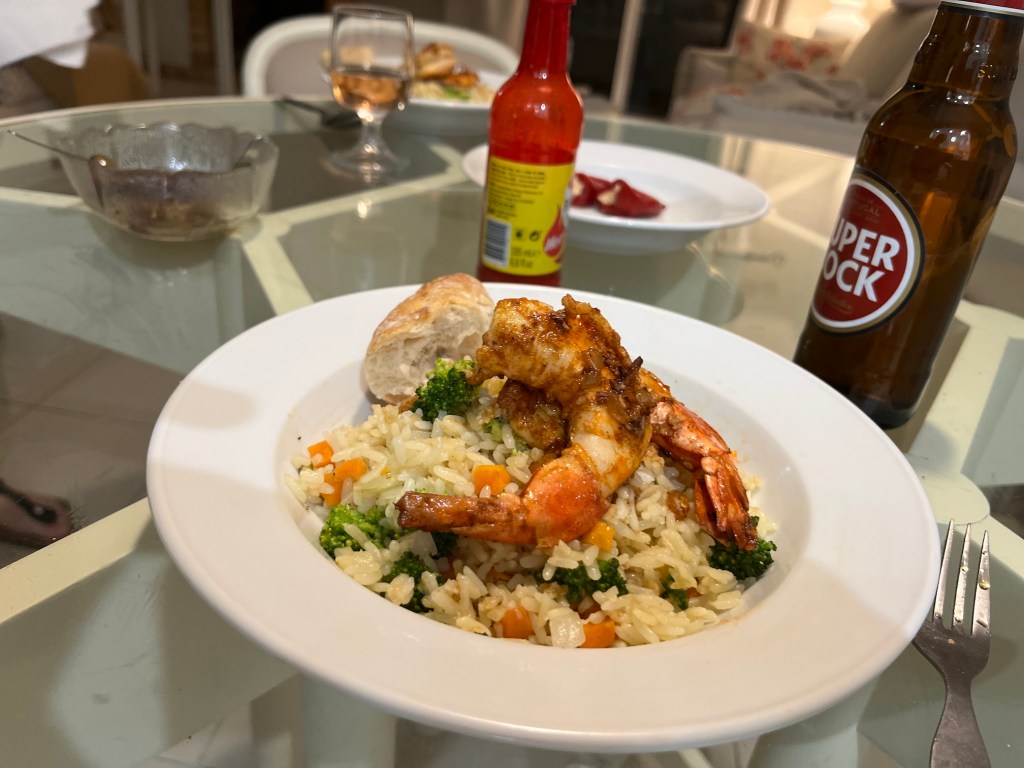 We cap off this food orgy with our now traditional toasted rice and veg, seafood style topped by some piri-piri crusted, pan-fried, locally caught blue shrimp. It’s a great topper and with bellies extended, we watch an 8 out of 10 cats before catching some z’s in what is our last night in the Algarve.