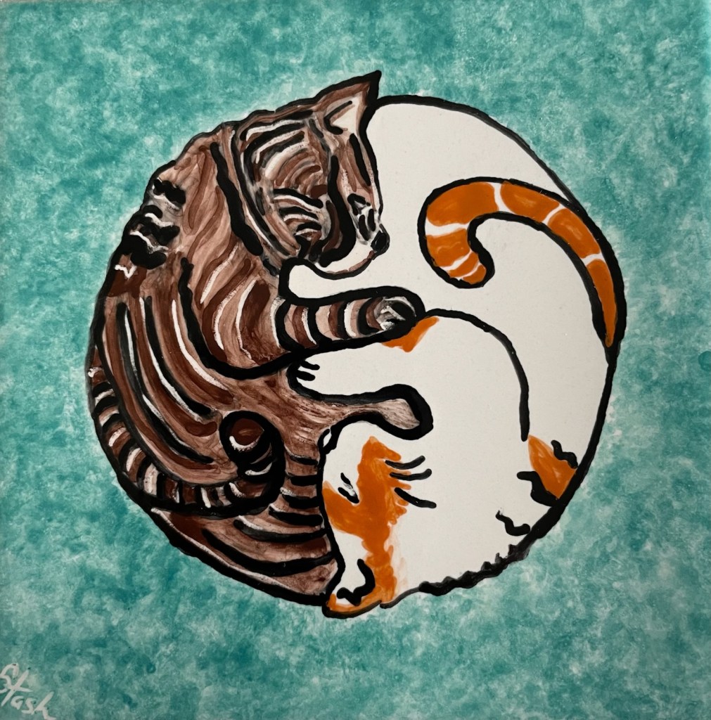 Stasia’s yin/yang of Johnny Rocket (who passed a couple years ago) and his brother Quincy Jones (still with us) reminds us so much of the past 15 years. Born in a barn and soon after adopted by us, we found them curled together like this so many times. We miss our Johnny and indulge in our memories, tears mixing with beers.